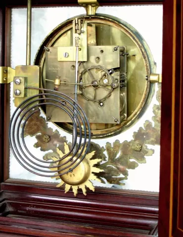 although there are some fly specs here and there and some stubborn dirt on the glasses, this clock is in overall excellent original condition, with great pierced and gilded hands, and a super porcelain dial, signed by the makers. F/S regulation is on a stud through the dial above 12. The starburst pendulum numbered 665, matches the number on the movement. Movement ticks and strikes, but has not been serviced. Ht 19 inches.