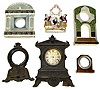 Six clock cases including three hand painted Chinas (one repaired), one small wood, 2 cast metal (one with dial) multiple lot, sold "as is".
