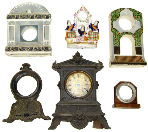 Six clock cases including three hand painted Chinas (one repaired), one small wood, 2 cast metal (one with dial)