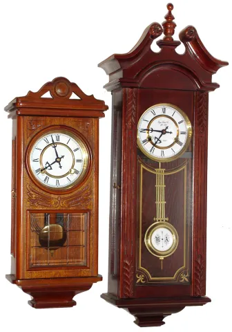 Two Korean modern reproduction mahogany 31 day time and strike wall clocks, late 20th century.