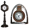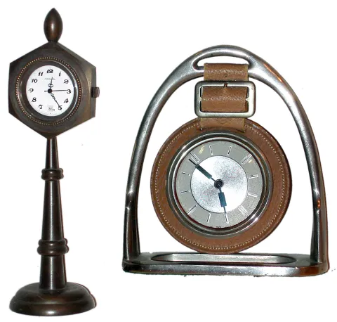 Two small 30-hour desk clocks, Jaguar Swiss mini street-clock and unsigned clock in a stirrup, later 20th century. Jaguar, with nice white dial, date indicator and sweep-seconds, is running in its heavy bronze case 7" tall. Leather-hanging clock is low-grade, missing its setter, but ticks, 5" high.