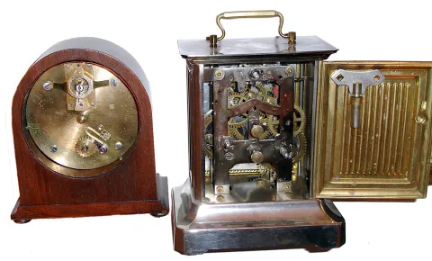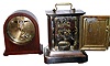 largest is German Mauthe nickel plate glass side carriage clock with musical alarm, 7" tall. Next is solid mahogany round top Herschede balance wheel timepiece18192, 5.5" tall. Smallest is Phinney Walker slant front heavy brass case with seconds track, marked "Eight Days" and "YUMA", 3.25" tall.