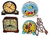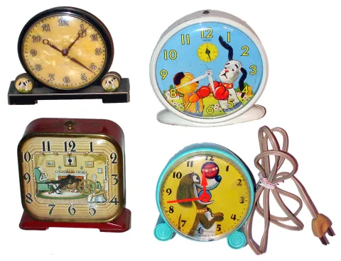 Oldest and best is Lux 30-hour alarm clock with animated spinning-wheel dial. Black-base Deco-style is German 8-day. Dogs with moving boxing gloves are from Smiths of England, 30-hour.. Bright-green plastic, with vibrating ball, is a plug-in GE. None have been tested.