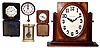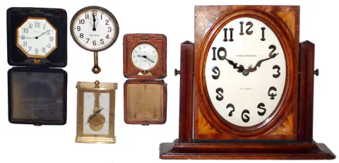 largest and best is Waltham inlaid-mahogany easel library clock with nouveau style hands and numbers, 10.5" high. The two travel clocks are Swiss Doxa in leather cases. The long stem car clock is a Waltham with silvered dial. The most modern is a West German brass Uwestra with a ladder style visible 7-jewel movement, 4" high. All tick but may need service.