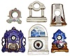 Three China novelty clocks, three China cases (six pieces total). Colorful cases, 3 complete clocks have pin pallet movements. multiple lot, sold "as is".