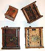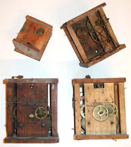 Four Black Forest wooden plate weight driven movements including three of standard size at 8" high and one unusual miniature size.