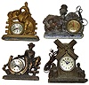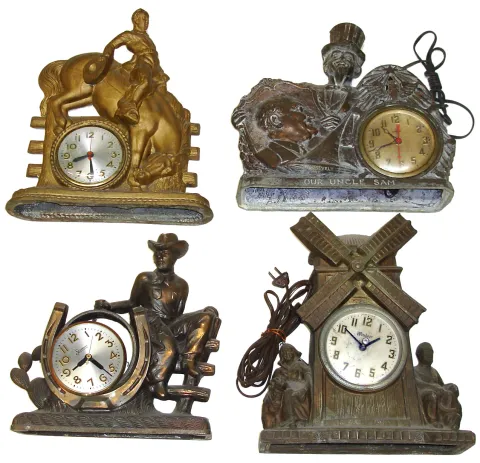 Four large electric cast metal figural clocks. 2 cowboys, Windsor windmill and United FDR and Uncle Sam, tallest is 14" high.
