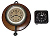 best is black Elapsed Time made for U.S. Navy, stamped AIB No. 2-59, ticks, starts-stops, zeroes to 12, 2.25" square. Other is dash clock now mounted on round wood base, 3.5" diameter.