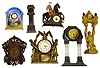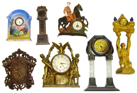 Seven novelty clocks. Includes long case bank (not functional clock), hand painted China, Gibraltar NRA workers, crystal column, and woman holding clock and two lights.