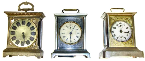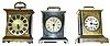 Three traveling clocks with top handles. Best and oldest is Seth Thomas striker with seconds bit and embossed front mask. Other 2 are modern Germans, one with alarm and other is Mercedes with MOP inlays. Tallest is 8" high.
