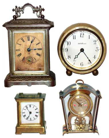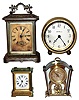 Four small desk and carriage clocks, c. 20th century largest is Ansonia fancy nickel plated time and alarm 30 hour carriage clock with original toned paper dial, 7.5" high. Smallest is Ansonia Apre 30 hour repeating gold-plated carriage clock with white porcelain dial (few hairlines), missing front glass, 3.5" high. Seth Thomas Jacket has a round cream-color Adamantine case, perfect white enamel dial and beveled glass, and 8-day 103C movement, 5" high. Schatz German 8-day novelty clock has nice floral dial and case, and visible balance, 5.5" high. All will need service.