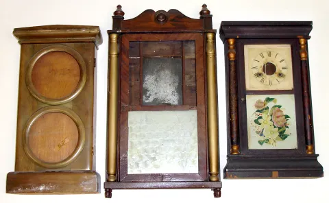 Three Connecticut clock cases (no movements). Smallest is Seth Thomas with label, glasses and dial. Middle original held a double dial calendar clock. Largest, column and splat with old mirror tablet, contained wooden works and is 32" tall.