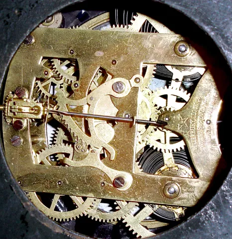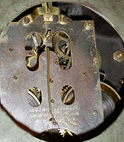 the Waterbury "Malta" has very good glossy black heavy case and double sunk white porcelain dial, beveled glass, and "star" movement, 10" high. The An...