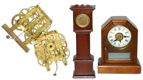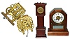 Five piece clock lot: Seth Thomas time/alarm; Waterbury long case German cuckoo, and 2 weight-driven 8-day striking movements, late 19th century.