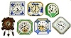 Seven small wall hanging novelty clocks. Colorful painted China and enameled metal clocks from Germany and U.S.A. 8 day, 30 hour and plug in. Largest is 9" square. multiple lot, sold "as is".