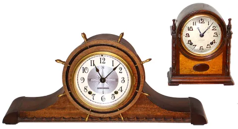 larger is Seth Thomas yacht wheel with movement dated 1945, interesting compass dial, back door label, 9.5" high. Smaller and older is mini New Haven ...