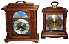 Two modern wood case bracket clocks with German Hermle 8 day Westminster chime movements. smaller is Barwick/Howard Miller with 1983 floating balance movement. Larger, 17" high, is Emperor kit with 1979 rolling moon pendulum movement. Both movements may need service.