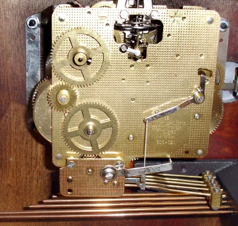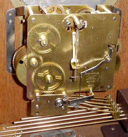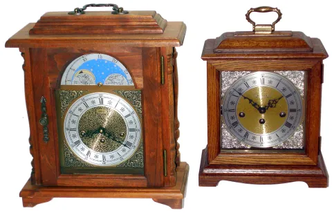 smaller is Barwick/Howard Miller with 1983 floating balance movement. Larger, 17" high, is Emperor kit with 1979 rolling moon pendulum movement. Both movements may need service.