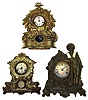 Three metal front Connecticut mantel clocks. Detailed cast fronts, wood boxes behind. Two are 30 hour, 8 day tallest (damaged) of standing sailor is 18" high.