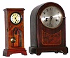 Two small German clocks, c1910. larger is Kienzle, Wurtemberg, round-top 8-day time-and-strike inlaid mahogany mantel clock with silvered dial, missing pendulum, 11.5" high. Smaller is cute long case with celluloid dial, 30-hour movement, 10" high. Both will need service.