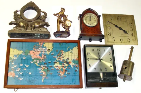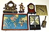 Seven pieces, mixed lot. Oldest is 19th-century Salter's English bottle jack for turning meat before the open hearth. Newest is "World Time" electric global map and local times. Also includes Seiko "Sonola" transistor plastic wall clock, figural brass