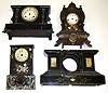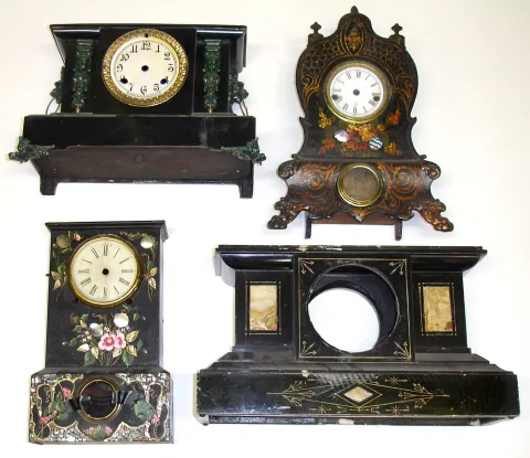 Four decorated black clock cases. 3 with dials. 2 iron fronts with lavish MOP inlay. 1 iron with cast feet and lion head handles. 1 French marble. Tallest is 16" high.