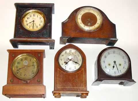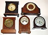 Five wood case 8-day mantel clocks. Two from England (Enfield and Davall), alarm clocks by Seth Thomas and National. Tallest, unsigned, is 11" high