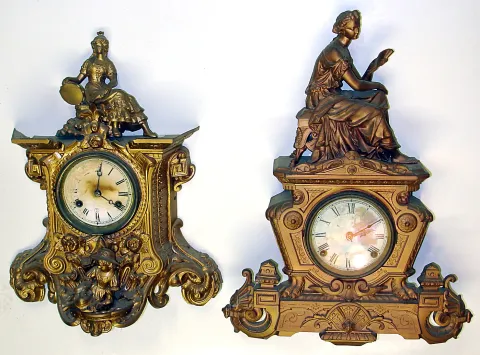 Two Connecticut cast metal 8 day figural mantel clocks, c. 1870. Detailed castings in old finish, shorter clock's top statue not attached and may belong to a different model. Both have replaced paper dials. Standard open spring striking movements will
