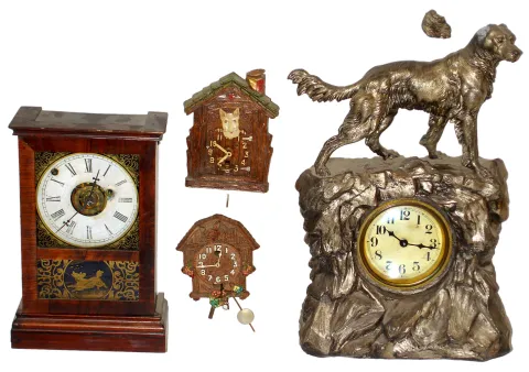 Four old dog-related 30-hour clocks. Oldest and best is an unsigned Connecticut time/alarm cottage clock with old reverse-paint tablets, 11" high. Two are pendulettes: Lux with wagging head; Keebler with see-saw. Largest is heavy cast-metal setter (broken ear, but part included) on mountaintop with rear-wind movement, 15" high. All will need service.