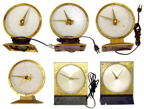 Six electric mystery clocks. 4 Jefferson Golden Hour clocks (one glass broken, one missing its red bottom cover), 2 square style (one missing its base and motor). multiple lot, sold "as is".