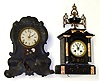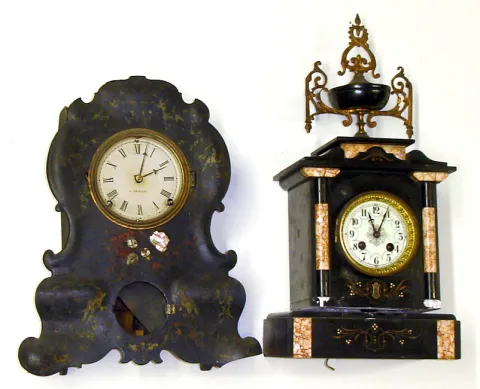 Two black 8 day mantel clocks for restoration. One is iron front with C.Jerome dial. Other is French marble with urn top and very clean bell strike movement, 19" tall.