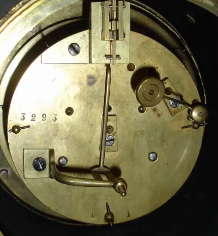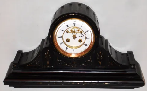 French black slate tambour drum head 8 day time and strike spring driven mantel clock, c1890 nice fluted stone case (few chips), porcelain dial with jewel-pallet visible escapement. Larger movement, missing its slow / fast setting arbor, may need cleaning. It is a heavy clock. Ht 11.5"