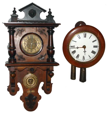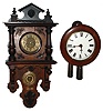 Two German walnut striking wall clocks, late 19th century. larger is free swinger 8 day, in nice old finish, with MFS (Mauthe) movement trademark and number 27048, nice patterned-brass dial and pendulum, 31" high to top of crest (old, but does not match rest of clock). Round 30 hour weight driven postman's clock, with wooden plates and arbors, has new dial, and Plexiglas side panels, and needs proper pendulum assembly, 12" diameter bezel.