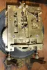 larger is free swinger 8 day, in nice old finish, with MFS (Mauthe) movement trademark and number 27048, nice patterned-brass dial and pendulum, 31" high to top of crest (old, but does not match rest of clock). Round 30 hour weight driven postman's clock, with wooden plates and arbors, has new dial, and Plexiglas side panels, and needs proper pendulum assembly, 12" diameter bezel.