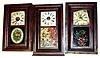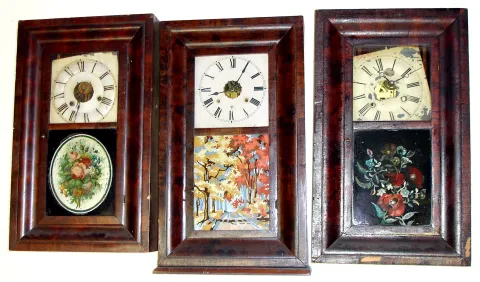 Three ogee 30 hour weight driven shelf clocks- an Ansonia Brass and Copper with colorful later painted glass of autumn foliage, a Seth Thomas with early oval floral glass and an E. and A. Ingraham (Waterbury movement) with later but well done floral