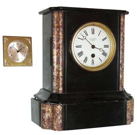 Two European clocks- French slate/marble 8-day time only spring driven mantel clock c1900 and a Altman and Co. Swiss 8 day travel clock with alarm c1940