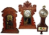 Banjo is a Sessions York mahogany time only, case has nice original glossy finish,26" high. Welch time and strike oak gingerbread has darkened rear label indicating that this is Assortment A, No. 4, 23" high. The Waterbury Upton oak time and strike is missing its dial and pendulum, has most of its large rear label, 22" high. New Haven gingerbread (not shown in photo) is missing its hands and base.