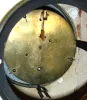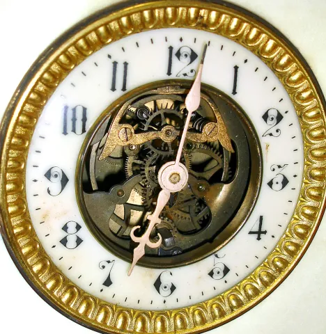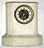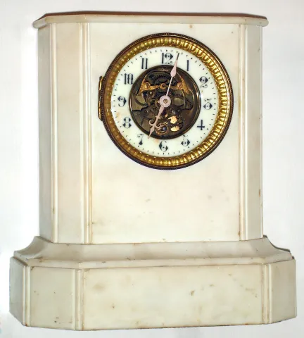 French alabaster 8 day mantel clock, c1890 creamy stone case in good condition with one side crack and few small chips, will need regluing of top to base. Interesting time-only movement with skeletonized front plate and Brocot escapement visible through open porcelain dial; will need cleaning. 11" tall.