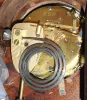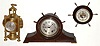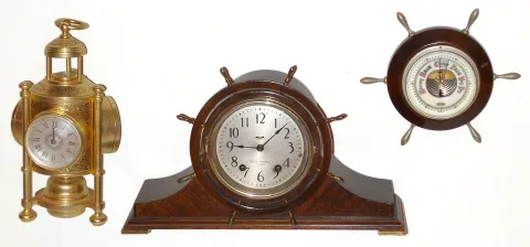 Three marine related items: Seth Thomas mahogany 7 jewel Helmsman ship's bells, 1938; modern brass weather station with quartz clock, barometer, compass, and thermometer; and German "Stellar" yacht wheel aneroid barometer.