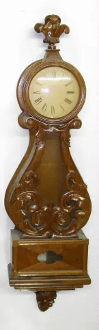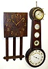 Two 8 day wood wall clocks and a lyre presentation banjo case only well carved and finished, with glasses and dial. One is dark oak E. Ingraham mission style. Other is unique home made mult dial with modern German Seth Thomas ship's bells clock on top and