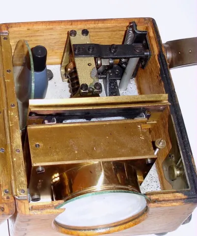 Well-made oak case is in nice condition except for broken leather handle. Inside looks used; operation and timekeeping not tested, but appears complete. 6" high not including ball-top lever.
