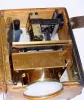 Benzing, German, oak cased pigeon-timing clock, 20th century. Well-made oak case is in nice condition except for broken leather handle. Inside looks used; operation and timekeeping not tested, but appears complete. 6" high not including ball-top lever.