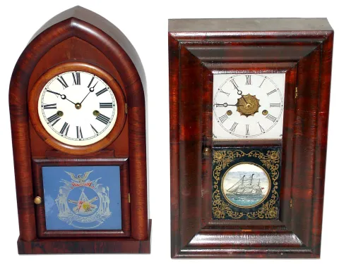 Two mahogany 30 hour time and strike Connecticut shelf clocks, late 19th century.