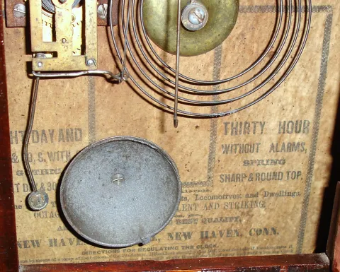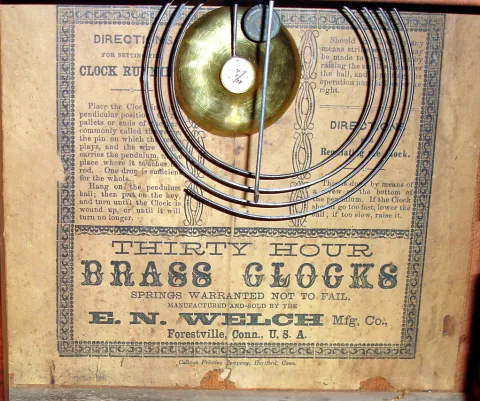 new Haven mini OG with old label, nice lower painted tablet of sailing ship, alarm, redone dial, and shiny old finish, 18" high. E.N. Welch beehive, r...