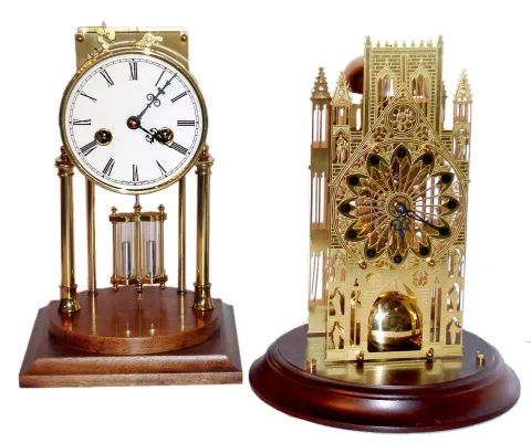 one simulates a skeleton clock with a one train passing strike 1985 Hermle movement. The other with a Schmid Schlenker two bell two train movement, has a simulated mercury pendulum. Both movements are very clean and shiny but may need service.