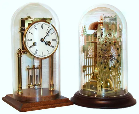 Two modern German 8 day striking clocks with brass movements on wood bases under round glass domes, 12" high. one simulates a skeleton clock with a one train passing strike 1985 Hermle movement. The other with a Schmid Schlenker two bell two train movement, has a simulated mercury pendulum. Both movements are very clean and shiny but may need service.