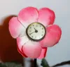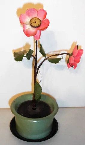 Desk clock German two rose plant with fabric petals and leaves in painted cast metal pot with Arabic numeral dial inset into center of upper rose, stem wind and stem set movement concealed in pot, c1930