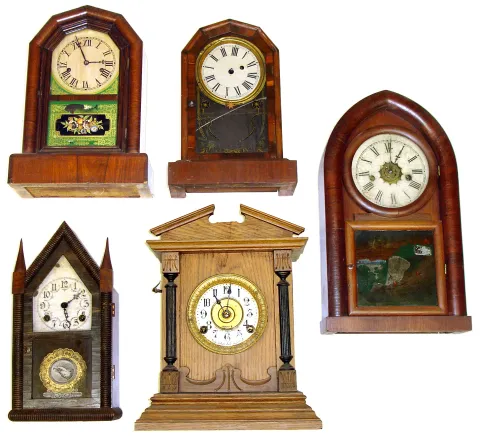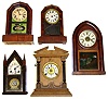 Five wood case shelf clocks. Includes Waterbury beehive, 2 octagon tops, small steeple with bold eagle glass, and Fattorini English alarm oak.