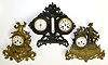 Three French cast metal 8 day mantel clocks. Two are ornate gilt figurals with reeded drum movement holders. Third is strut style weather station with twin scale thermometer, aneroid barometer with "Vebanderlyk" etc. readings, and bell strike movement with tic-tac pendulum, 14" tall. multiple lot, sold "as is".