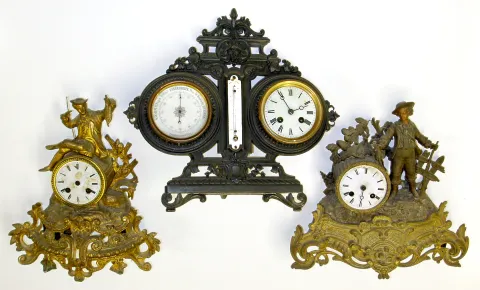 Three French cast metal 8 day mantel clocks. Two are ornate gilt figurals with reeded drum movement holders. Third is strut style weather station with twin scale thermometer, aneroid barometer with "Vebanderlyk" etc. readings, and bell strike movement
